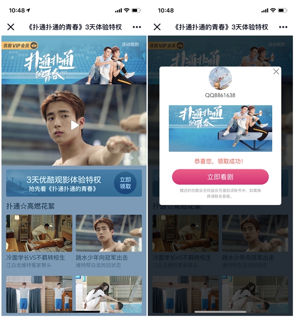 在活动界面点击“立即领取”可以领取三天优酷观影特权 抢先看《扑通扑通的青春》