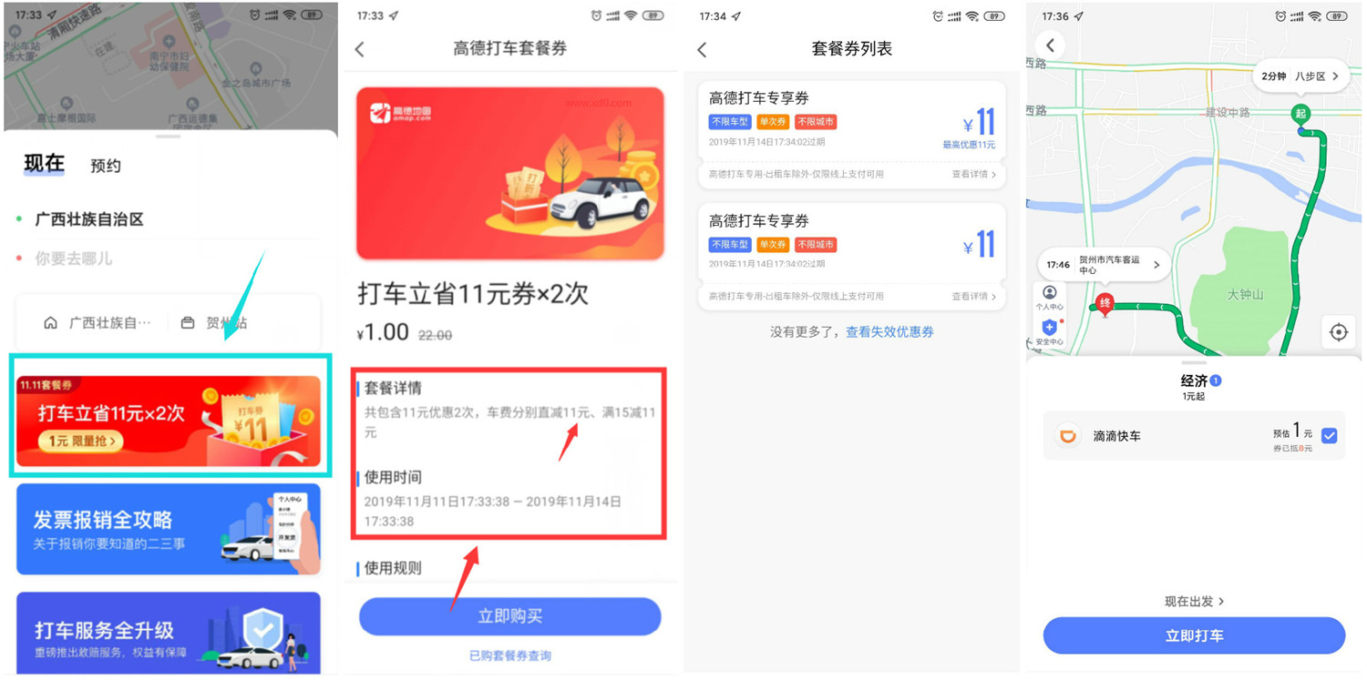 按照购买->券有效期到11.14日->这3天要打车的可以上!